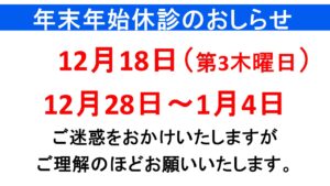 年末年始の休診日は、12月28日~新年1月4日までとさせていただきます。