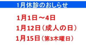 今月は、12日成人の日、15日第3木曜日とお休みさせていただきます。