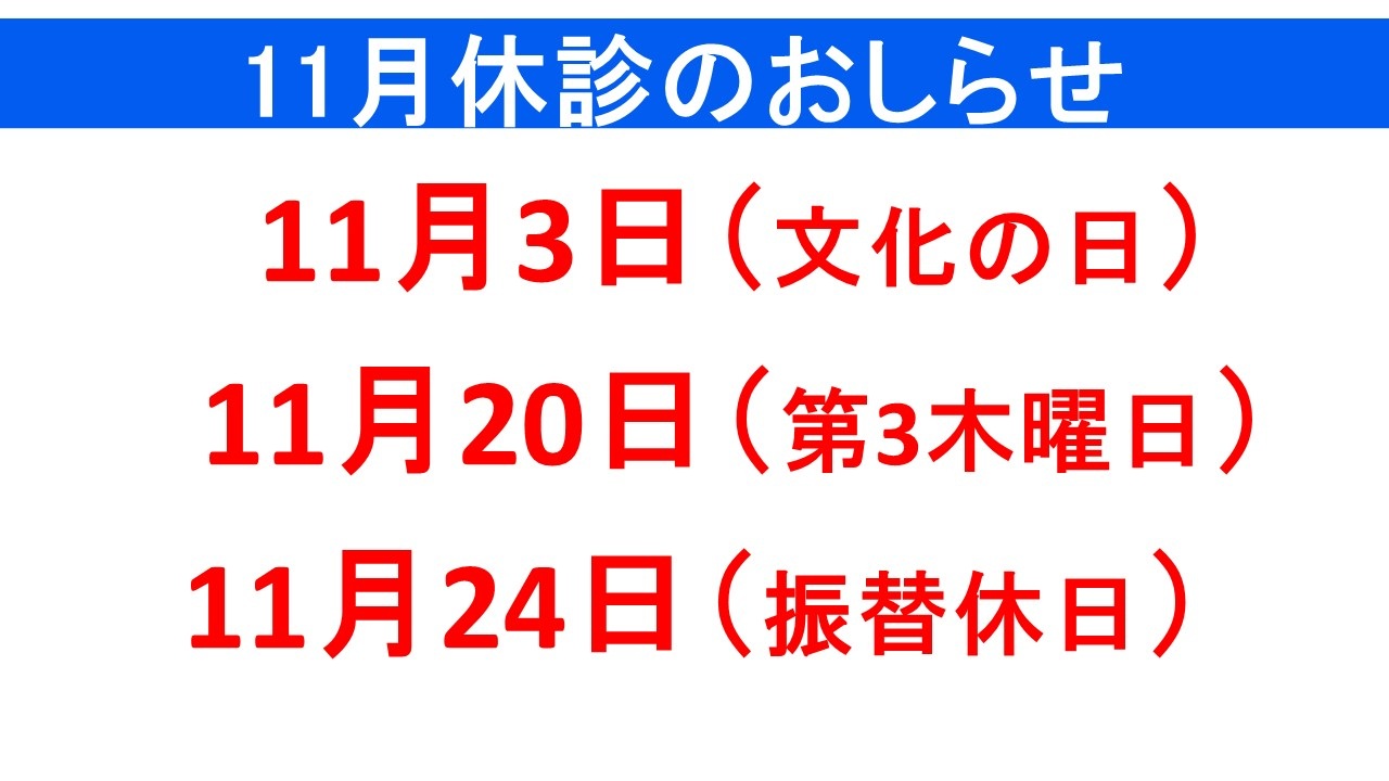 11月は3日(文化の日)20日(第3水曜日)24日(振替休日)をお休みをいただきます。